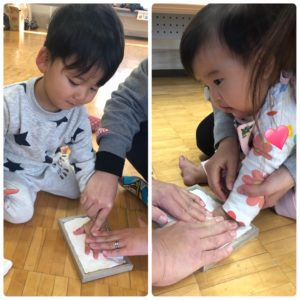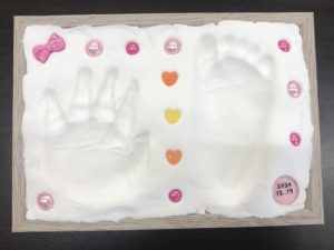 先月おしゃべり会が中止になってできなかった、手形足形のメモリアルフォトフレーム作りをしました?